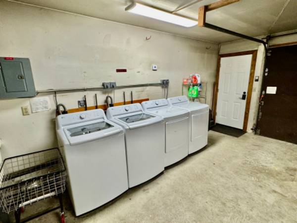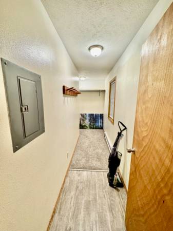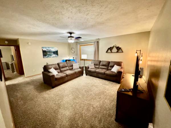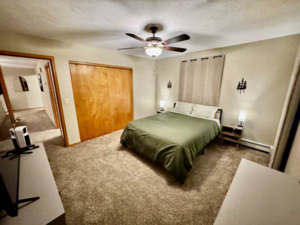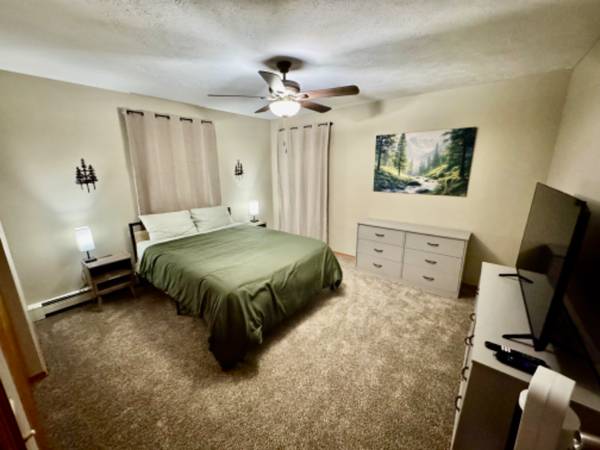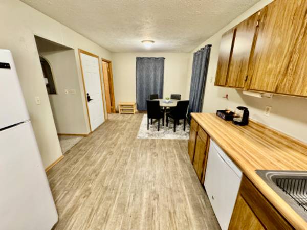 This spacious 1,100 sq ft top-floor apartment offers all living areas and bedrooms on a single level for convenience and comfort. The open layout features a kitchen, dining area, and living room designed for easy flow and functionality. Two bedrooms, each furnished with a comfortable queen-size bed, share access to a full bathroom. Free shared laundry is available in the garage for guest use. This apartment is conveniently located near Fairbanks Memorial Hospital, ideal for medical professionals, patients’ families, or anyone needing close access to healthcare. The neighborhood is quiet yet close to grocery stores, coffee shops, and local dining. Downtown Fairbanks is a short drive away for shopping and entertainment. Nearby parks and trails offer year-round outdoor activities, and with easy access to major roads, getting around the city is simple and convenient. A background check is required for tenant screening.