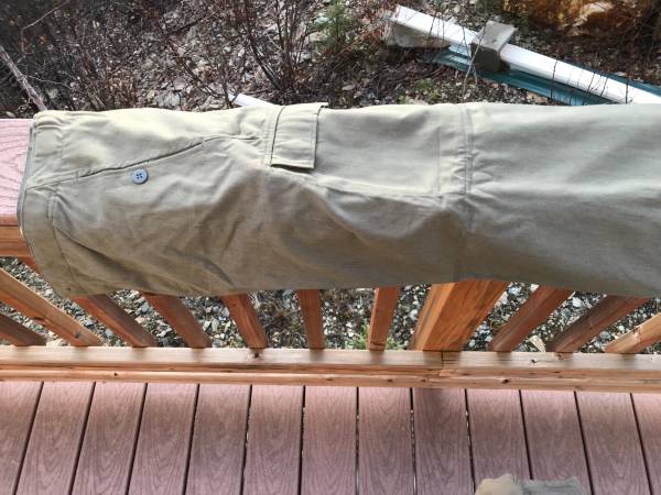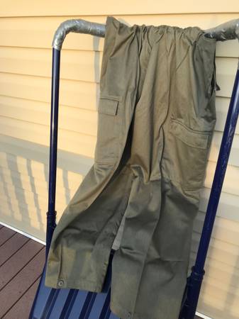 Button fly military cargo pants. Button to adjust the finished cuff. m56 in Red on the pants. inseam measurement (28). Flaw on the right pant leg below the pocket.