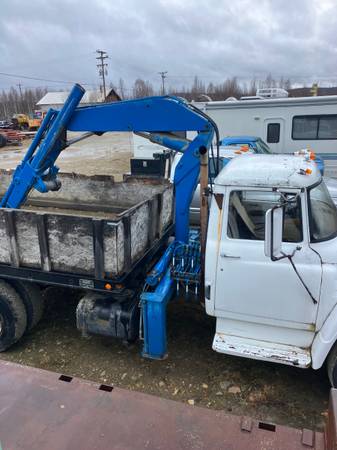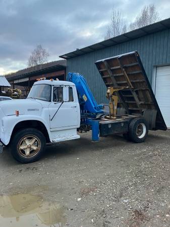 75 International 1750 boom truck. Has a HAIB knuckle boom, dump flat bed, 345 gas motor, 5 speed transmission. Truck runs and operates good, tires are fair, goes down the road well. Will haul and dump about 3 yards of material. Removed rotten side boards and stowed boom in last two pics. 907-five90-five4seven2