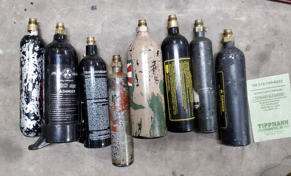 Included is everything pictured, a Tippman 98 and a Tippman 68, both of which functioned well last time they were out. The third blue paint marker is a project that a buddy gave me. I haven't messed with it, but it isn't operational. Some of the CO2 tanks still have gas and there is a almost full box of paintballs.